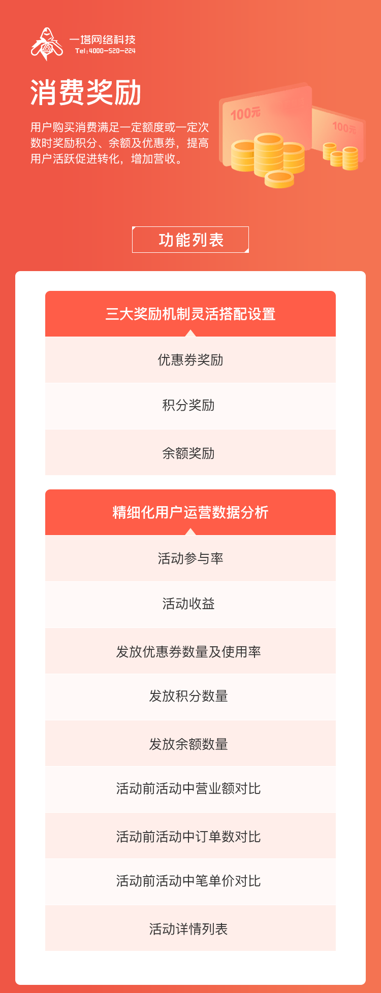 用户购买消费满足一定额度或一定次数时奖励积分、余额及优惠券,提高用户活跃促进转化,增加营收。
