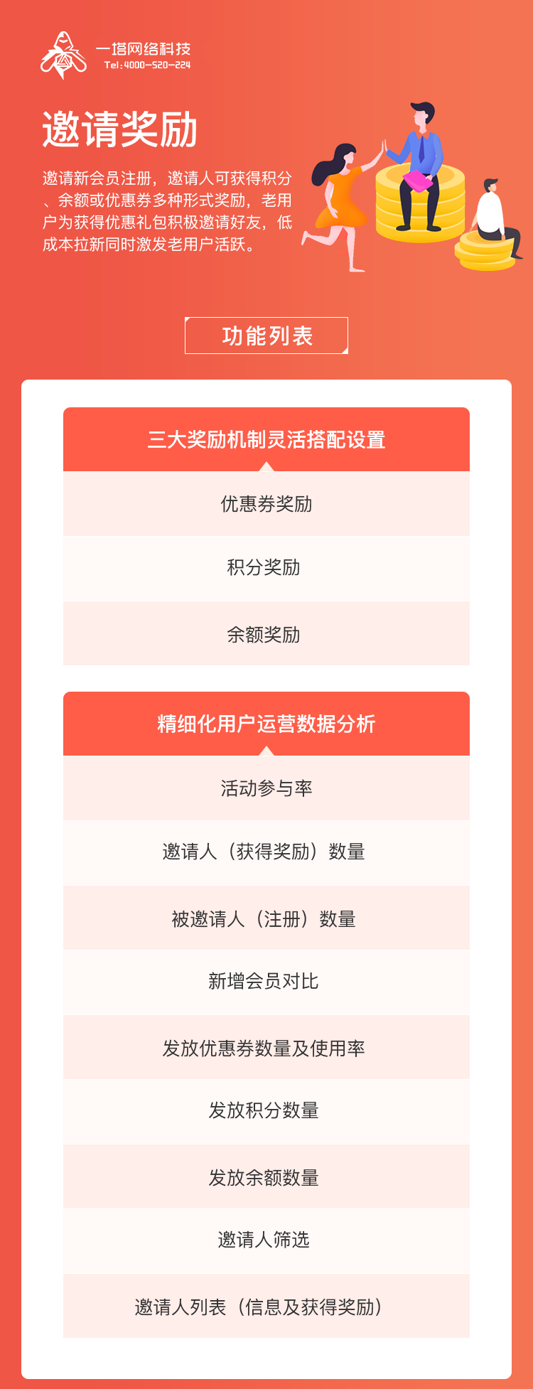 邀请新会员注册,邀请人可获得积分余额或优惠券多种形式奖励,老用户为获得优惠礼包积极邀请好友,低成本拉新同时激发老用户活跃。